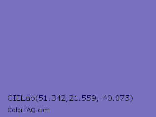 CIELab 51.342,21.559,-40.075 Color is a normal indigo color and the nearest color is Toolbox #746cc0. Hex code #7871bf and RGB value is rgb(120,113,191). In RGB color space, this color is composed of 47% red, 44% green, 75% blue, In CMYK color space, this color is composed of 37% cyan, 41% magenta, 0% yellow , 25% black , In HSL color space, this color has a hue angle of 245° , 38% saturation and 60% lightness.