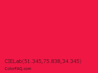 CIELab 51.345,75.838,34.345 Color is a normal red color and the nearest color is Red Crayola #ee204d. Hex code #f01745 and RGB value is rgb(240,23,69). In RGB color space, this color is composed of 94% red, 9% green, 27% blue, In CMYK color space, this color is composed of 0% cyan, 90% magenta, 71% yellow , 6% black , In HSL color space, this color has a hue angle of 347° , 88% saturation and 52% lightness.