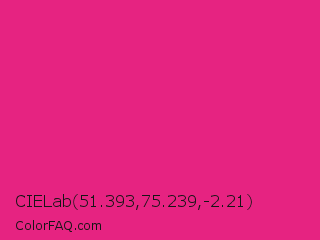 CIELab 51.393,75.239,-2.21 Color is a normal rose color and the nearest color is Barbie Pink #e0218a. Hex code #e62381 and RGB value is rgb(230,35,129). In RGB color space, this color is composed of 90% red, 14% green, 51% blue, In CMYK color space, this color is composed of 0% cyan, 85% magenta, 44% yellow , 10% black , In HSL color space, this color has a hue angle of 331° , 80% saturation and 52% lightness.