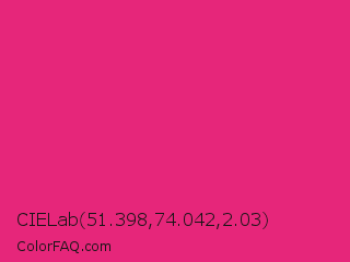 CIELab 51.398,74.042,2.03 Color is a normal rose color and the nearest color is Razzmatazz #e3256b. Hex code #e6267a and RGB value is rgb(230,38,122). In RGB color space, this color is composed of 90% red, 15% green, 48% blue, In CMYK color space, this color is composed of 0% cyan, 83% magenta, 47% yellow , 10% black , In HSL color space, this color has a hue angle of 334° , 79% saturation and 53% lightness.