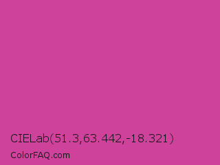 CIELab 51.3,63.442,-18.321 Color is a normal magenta color and the nearest color is Pink Pantone #d74894. Hex code #cf429b and RGB value is rgb(207,66,155). In RGB color space, this color is composed of 81% red, 26% green, 61% blue, In CMYK color space, this color is composed of 0% cyan, 68% magenta, 25% yellow , 19% black , In HSL color space, this color has a hue angle of 322° , 59% saturation and 54% lightness.