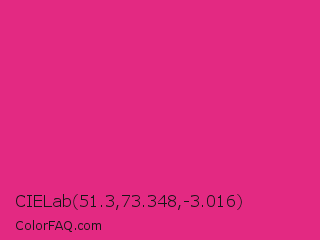 CIELab 51.3,73.348,-3.016 Color is a normal rose color and the nearest color is Barbie Pink #e0218a. Hex code #e32982 and RGB value is rgb(227,41,130). In RGB color space, this color is composed of 89% red, 16% green, 51% blue, In CMYK color space, this color is composed of 0% cyan, 82% magenta, 43% yellow , 11% black , In HSL color space, this color has a hue angle of 331° , 77% saturation and 53% lightness.