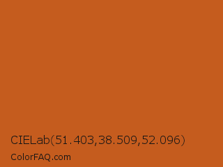 CIELab 51.403,38.509,52.096 Color is a normal orange color and the nearest color is Orange Roughy #c45719. Hex code #c55c1e and RGB value is rgb(197,92,30). In RGB color space, this color is composed of 77% red, 36% green, 12% blue, In CMYK color space, this color is composed of 0% cyan, 53% magenta, 85% yellow , 23% black , In HSL color space, this color has a hue angle of 22° , 74% saturation and 45% lightness.