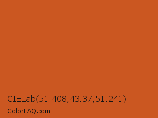CIELab 51.408,43.37,51.241 Color is a normal orange color and the nearest color is Orange Roughy #c45719. Hex code #cb5721 and RGB value is rgb(203,87,33). In RGB color space, this color is composed of 80% red, 34% green, 13% blue, In CMYK color space, this color is composed of 0% cyan, 57% magenta, 84% yellow , 20% black , In HSL color space, this color has a hue angle of 19° , 72% saturation and 46% lightness.