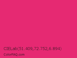 CIELab 51.409,72.752,6.894 Color is a normal rose color and the nearest color is Razzmatazz #e3256b. Hex code #e62972 and RGB value is rgb(230,41,114). In RGB color space, this color is composed of 90% red, 16% green, 45% blue, In CMYK color space, this color is composed of 0% cyan, 82% magenta, 50% yellow , 10% black , In HSL color space, this color has a hue angle of 337° , 79% saturation and 53% lightness.