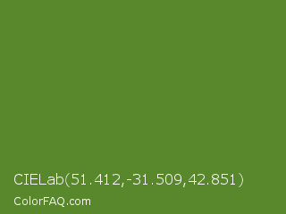 CIELab 51.412,-31.509,42.851 Color is a normal green color and the nearest color is Maximum Green #5e8c31. Hex code #59872b and RGB value is rgb(89,135,43). In RGB color space, this color is composed of 35% red, 53% green, 17% blue, In CMYK color space, this color is composed of 34% cyan, 0% magenta, 68% yellow , 47% black , In HSL color space, this color has a hue angle of 90° , 52% saturation and 35% lightness.