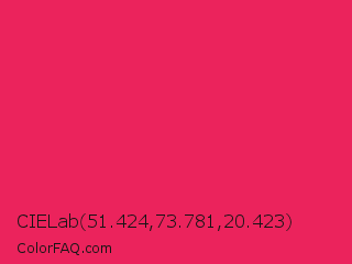 CIELab 51.424,73.781,20.423 Color is a normal rose color and the nearest color is Red Crayola #ee204d. Hex code #eb235c and RGB value is rgb(235,35,92). In RGB color space, this color is composed of 92% red, 14% green, 36% blue, In CMYK color space, this color is composed of 0% cyan, 85% magenta, 61% yellow , 8% black , In HSL color space, this color has a hue angle of 343° , 83% saturation and 53% lightness.