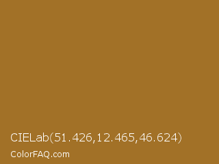 CIELab 51.426,12.465,46.624 Color is a normal orange color and the nearest color is Mandalay #ad781b. Hex code #a27127 and RGB value is rgb(162,113,39). In RGB color space, this color is composed of 64% red, 44% green, 15% blue, In CMYK color space, this color is composed of 0% cyan, 30% magenta, 76% yellow , 36% black , In HSL color space, this color has a hue angle of 36° , 61% saturation and 39% lightness.