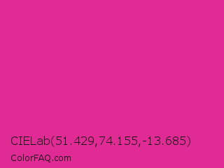 CIELab 51.429,74.155,-13.685 Color is a normal magenta color and the nearest color is Barbie Pink #e0218a. Hex code #e02a94 and RGB value is rgb(224,42,148). In RGB color space, this color is composed of 88% red, 16% green, 58% blue, In CMYK color space, this color is composed of 0% cyan, 81% magenta, 34% yellow , 12% black , In HSL color space, this color has a hue angle of 325° , 75% saturation and 52% lightness.