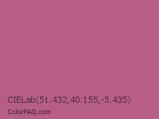 CIELab 51.432,40.155,-5.435 Color is a normal rose color and the nearest color is Tapestry #b05e81. Hex code #b65e85 and RGB value is rgb(182,94,133). In RGB color space, this color is composed of 71% red, 37% green, 52% blue, In CMYK color space, this color is composed of 0% cyan, 48% magenta, 27% yellow , 29% black , In HSL color space, this color has a hue angle of 333° , 38% saturation and 54% lightness.