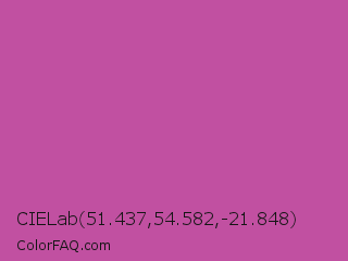 CIELab 51.437,54.582,-21.848 Color is a normal magenta color and the nearest color is Mulberry #c54b8c. Hex code #c150a1 and RGB value is rgb(193,80,161). In RGB color space, this color is composed of 76% red, 31% green, 63% blue, In CMYK color space, this color is composed of 0% cyan, 59% magenta, 17% yellow , 24% black , In HSL color space, this color has a hue angle of 317° , 48% saturation and 54% lightness.