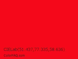 CIELab 51.437,77.335,58.636 Color is a normal red color and the nearest color is Vivid Red #f70d1a. Hex code #f50817 and RGB value is rgb(245,8,23). In RGB color space, this color is composed of 96% red, 3% green, 9% blue, In CMYK color space, this color is composed of 0% cyan, 97% magenta, 91% yellow , 4% black , In HSL color space, this color has a hue angle of 356° , 94% saturation and 50% lightness.