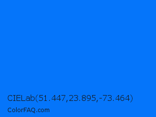 CIELab 51.447,23.895,-73.464 Color is a normal blue color and the nearest color is Brandeis Blue #0070ff. Hex code #0575fa and RGB value is rgb(5,117,250). In RGB color space, this color is composed of 2% red, 46% green, 98% blue, In CMYK color space, this color is composed of 98% cyan, 53% magenta, 0% yellow , 2% black , In HSL color space, this color has a hue angle of 213° , 96% saturation and 50% lightness.
