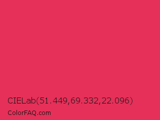 CIELab 51.449,69.332,22.096 Color is a normal red color and the nearest color is Amaranth #e52b50. Hex code #e63059 and RGB value is rgb(230,48,89). In RGB color space, this color is composed of 90% red, 19% green, 35% blue, In CMYK color space, this color is composed of 0% cyan, 79% magenta, 61% yellow , 10% black , In HSL color space, this color has a hue angle of 346° , 78% saturation and 55% lightness.
