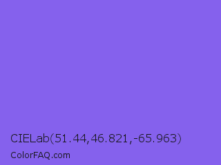 CIELab 51.44,46.821,-65.963 Color is a light indigo color and the nearest color is Medium Slate Blue #7b68ee. Hex code #8561ed and RGB value is rgb(133,97,237). In RGB color space, this color is composed of 52% red, 38% green, 93% blue, In CMYK color space, this color is composed of 44% cyan, 59% magenta, 0% yellow , 7% black , In HSL color space, this color has a hue angle of 255° , 80% saturation and 65% lightness.