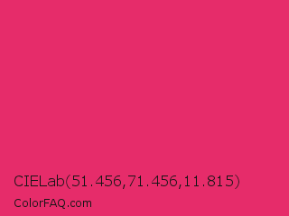 CIELab 51.456,71.456,11.815 Color is a normal rose color and the nearest color is Razzmatazz #e3256b. Hex code #e62c6a and RGB value is rgb(230,44,106). In RGB color space, this color is composed of 90% red, 17% green, 42% blue, In CMYK color space, this color is composed of 0% cyan, 81% magenta, 54% yellow , 10% black , In HSL color space, this color has a hue angle of 340° , 79% saturation and 54% lightness.