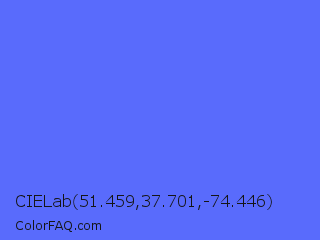 CIELab 51.459,37.701,-74.446 Color is a light blue color and the nearest color is Very Light Blue #6666ff. Hex code #596bfc and RGB value is rgb(89,107,252). In RGB color space, this color is composed of 35% red, 42% green, 99% blue, In CMYK color space, this color is composed of 65% cyan, 58% magenta, 0% yellow , 1% black , In HSL color space, this color has a hue angle of 233° , 96% saturation and 67% lightness.