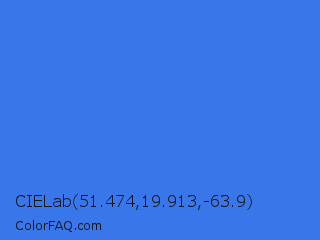 CIELab 51.474,19.913,-63.9 Color is a normal blue color and the nearest color is Royal Blue #4169e1. Hex code #3876e9 and RGB value is rgb(56,118,233). In RGB color space, this color is composed of 22% red, 46% green, 91% blue, In CMYK color space, this color is composed of 76% cyan, 49% magenta, 0% yellow , 9% black , In HSL color space, this color has a hue angle of 219° , 80% saturation and 57% lightness.
