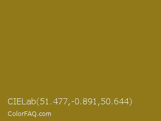 CIELab 51.477,-0.891,50.644 Color is a normal yellow color and the nearest color is Sand Dune #967117. Hex code #90791b and RGB value is rgb(144,121,27). In RGB color space, this color is composed of 56% red, 47% green, 11% blue, In CMYK color space, this color is composed of 0% cyan, 16% magenta, 81% yellow , 44% black , In HSL color space, this color has a hue angle of 48° , 68% saturation and 34% lightness.
