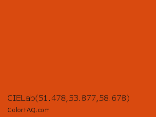CIELab 51.478,53.877,58.678 Color is a normal orange color and the nearest color is Grenadier #d54600. Hex code #d94a0f and RGB value is rgb(217,74,15). In RGB color space, this color is composed of 85% red, 29% green, 6% blue, In CMYK color space, this color is composed of 0% cyan, 66% magenta, 93% yellow , 15% black , In HSL color space, this color has a hue angle of 18° , 87% saturation and 45% lightness.