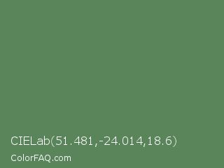 CIELab 51.481,-24.014,18.6 Color is a normal green color and the nearest color is Glade Green #61845f. Hex code #5a855a and RGB value is rgb(90,133,90). In RGB color space, this color is composed of 35% red, 52% green, 35% blue, In CMYK color space, this color is composed of 32% cyan, 0% magenta, 32% yellow , 48% black , In HSL color space, this color has a hue angle of 120° , 19% saturation and 44% lightness.