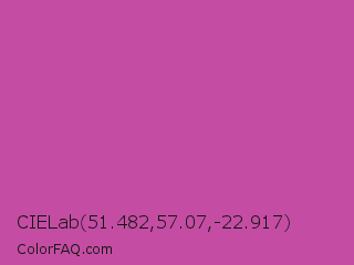 CIELab 51.482,57.07,-22.917 Color is a normal magenta color and the nearest color is Mulberry #c54b8c. Hex code #c44da3 and RGB value is rgb(196,77,163). In RGB color space, this color is composed of 77% red, 30% green, 64% blue, In CMYK color space, this color is composed of 0% cyan, 61% magenta, 17% yellow , 23% black , In HSL color space, this color has a hue angle of 317° , 50% saturation and 54% lightness.
