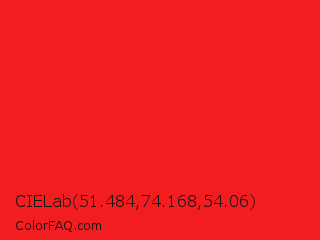 CIELab 51.484,74.168,54.06 Color is a normal red color and the nearest color is Red Pigment #ed1c24. Hex code #f11d21 and RGB value is rgb(241,29,33). In RGB color space, this color is composed of 95% red, 11% green, 13% blue, In CMYK color space, this color is composed of 0% cyan, 88% magenta, 86% yellow , 5% black , In HSL color space, this color has a hue angle of 359° , 88% saturation and 53% lightness.