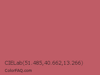 CIELab 51.485,40.662,13.266 Color is a normal red color and the nearest color is Popstar #be4f62. Hex code #bf5c66 and RGB value is rgb(191,92,102). In RGB color space, this color is composed of 75% red, 36% green, 40% blue, In CMYK color space, this color is composed of 0% cyan, 52% magenta, 47% yellow , 25% black , In HSL color space, this color has a hue angle of 354° , 44% saturation and 55% lightness.