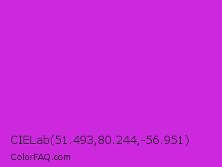 CIELab 51.493,80.244,-56.951 Color is a normal magenta color and the nearest color is Steel Pink #cc33cc. Hex code #cc29de and RGB value is rgb(204,41,222). In RGB color space, this color is composed of 80% red, 16% green, 87% blue, In CMYK color space, this color is composed of 8% cyan, 82% magenta, 0% yellow , 13% black , In HSL color space, this color has a hue angle of 294° , 73% saturation and 52% lightness.