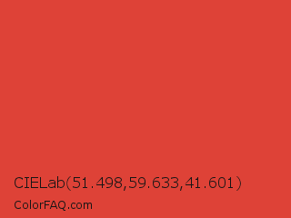 CIELab 51.498,59.633,41.601 Color is a normal red color and the nearest color is Punch #dc4333. Hex code #de4237 and RGB value is rgb(222,66,55). In RGB color space, this color is composed of 87% red, 26% green, 22% blue, In CMYK color space, this color is composed of 0% cyan, 70% magenta, 75% yellow , 13% black , In HSL color space, this color has a hue angle of 4° , 72% saturation and 54% lightness.