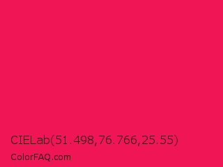 CIELab 51.498,76.766,25.55 Color is a normal rose color and the nearest color is Red Crayola #ee204d. Hex code #f01554 and RGB value is rgb(240,21,84). In RGB color space, this color is composed of 94% red, 8% green, 33% blue, In CMYK color space, this color is composed of 0% cyan, 91% magenta, 65% yellow , 6% black , In HSL color space, this color has a hue angle of 343° , 88% saturation and 51% lightness.