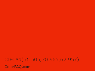 CIELab 51.505,70.965,62.957 Color is a normal red color and the nearest color is Ferrari Red #ff2800. Hex code #ee2806 and RGB value is rgb(238,40,6). In RGB color space, this color is composed of 93% red, 16% green, 2% blue, In CMYK color space, this color is composed of 0% cyan, 83% magenta, 97% yellow , 7% black , In HSL color space, this color has a hue angle of 9° , 95% saturation and 48% lightness.