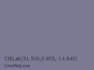 CIELab 51.506,6.855,-14.845 Color is a normal indigo color and the nearest color is Rhythm #777696. Hex code #7a7894 and RGB value is rgb(122,120,148). In RGB color space, this color is composed of 48% red, 47% green, 58% blue, In CMYK color space, this color is composed of 18% cyan, 19% magenta, 0% yellow , 42% black , In HSL color space, this color has a hue angle of 244° , 12% saturation and 53% lightness.