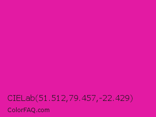 CIELab 51.512,79.457,-22.429 Color is a normal magenta color and the nearest color is Barbie Pink #e0218a. Hex code #e31aa3 and RGB value is rgb(227,26,163). In RGB color space, this color is composed of 89% red, 10% green, 64% blue, In CMYK color space, this color is composed of 0% cyan, 89% magenta, 28% yellow , 11% black , In HSL color space, this color has a hue angle of 319° , 79% saturation and 50% lightness.