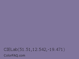 CIELab 51.51,12.542,-19.471 Color is a normal indigo color and the nearest color is Rhythm #777696. Hex code #80759c and RGB value is rgb(128,117,156). In RGB color space, this color is composed of 50% red, 46% green, 61% blue, In CMYK color space, this color is composed of 18% cyan, 25% magenta, 0% yellow , 39% black , In HSL color space, this color has a hue angle of 257° , 16% saturation and 54% lightness.