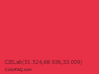 CIELab 51.524,68.936,33.009 Color is a normal red color and the nearest color is Amaranth #e52b50. Hex code #e83047 and RGB value is rgb(232,48,71). In RGB color space, this color is composed of 91% red, 19% green, 28% blue, In CMYK color space, this color is composed of 0% cyan, 79% magenta, 69% yellow , 9% black , In HSL color space, this color has a hue angle of 353° , 80% saturation and 55% lightness.