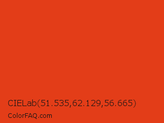 CIELab 51.535,62.129,56.665 Color is a normal red color and the nearest color is Vermilion #d9381e. Hex code #e33d18 and RGB value is rgb(227,61,24). In RGB color space, this color is composed of 89% red, 24% green, 9% blue, In CMYK color space, this color is composed of 0% cyan, 73% magenta, 89% yellow , 11% black , In HSL color space, this color has a hue angle of 11° , 81% saturation and 49% lightness.