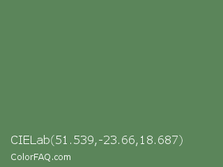 CIELab 51.539,-23.66,18.687 Color is a normal green color and the nearest color is Glade Green #61845f. Hex code #5b855a and RGB value is rgb(91,133,90). In RGB color space, this color is composed of 36% red, 52% green, 35% blue, In CMYK color space, this color is composed of 32% cyan, 0% magenta, 32% yellow , 48% black , In HSL color space, this color has a hue angle of 119° , 19% saturation and 44% lightness.
