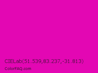 CIELab 51.539,83.237,-31.813 Color is a normal magenta color and the nearest color is Hollywood Cerise #f400a1. Hex code #e307b3 and RGB value is rgb(227,7,179). In RGB color space, this color is composed of 89% red, 3% green, 70% blue, In CMYK color space, this color is composed of 0% cyan, 97% magenta, 21% yellow , 11% black , In HSL color space, this color has a hue angle of 313° , 94% saturation and 46% lightness.