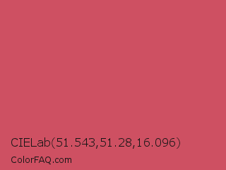CIELab 51.543,51.28,16.096 Color is a normal red color and the nearest color is Dark Terra Cotta #cc4e5c. Hex code #ce5062 and RGB value is rgb(206,80,98). In RGB color space, this color is composed of 81% red, 31% green, 38% blue, In CMYK color space, this color is composed of 0% cyan, 61% magenta, 52% yellow , 19% black , In HSL color space, this color has a hue angle of 351° , 56% saturation and 56% lightness.