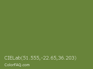 CIELab 51.555,-22.65,36.203 Color is a normal green color and the nearest color is Maximum Green #5e8c31. Hex code #68843a and RGB value is rgb(104,132,58). In RGB color space, this color is composed of 41% red, 52% green, 23% blue, In CMYK color space, this color is composed of 21% cyan, 0% magenta, 56% yellow , 48% black , In HSL color space, this color has a hue angle of 83° , 39% saturation and 37% lightness.