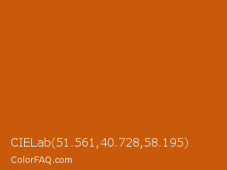 CIELab 51.561,40.728,58.195 Color is a normal orange color and the nearest color is Alloy Orange #c46210. Hex code #c95a0c and RGB value is rgb(201,90,12). In RGB color space, this color is composed of 79% red, 35% green, 5% blue, In CMYK color space, this color is composed of 0% cyan, 55% magenta, 94% yellow , 21% black , In HSL color space, this color has a hue angle of 25° , 89% saturation and 42% lightness.