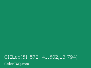 CIELab 51.572,-41.602,13.794 Color is a normal green color and the nearest color is Deep Green Cyan Turquoise #0e7c61. Hex code #128c62 and RGB value is rgb(18,140,98). In RGB color space, this color is composed of 7% red, 55% green, 38% blue, In CMYK color space, this color is composed of 87% cyan, 0% magenta, 30% yellow , 45% black , In HSL color space, this color has a hue angle of 159° , 77% saturation and 31% lightness.