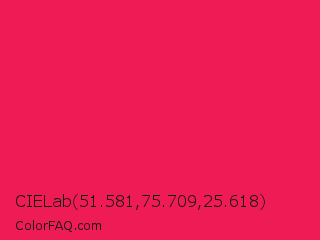 CIELab 51.581,75.709,25.618 Color is a normal rose color and the nearest color is Red Crayola #ee204d. Hex code #ef1b54 and RGB value is rgb(239,27,84). In RGB color space, this color is composed of 94% red, 11% green, 33% blue, In CMYK color space, this color is composed of 0% cyan, 89% magenta, 65% yellow , 6% black , In HSL color space, this color has a hue angle of 344° , 87% saturation and 52% lightness.