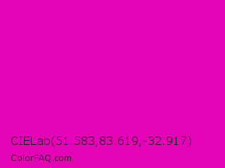 CIELab 51.583,83.619,-32.917 Color is a normal magenta color and the nearest color is Hollywood Cerise #f400a1. Hex code #e305b5 and RGB value is rgb(227,5,181). In RGB color space, this color is composed of 89% red, 2% green, 71% blue, In CMYK color space, this color is composed of 0% cyan, 98% magenta, 20% yellow , 11% black , In HSL color space, this color has a hue angle of 312° , 96% saturation and 45% lightness.