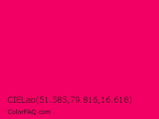 CIELab 51.585,79.816,16.618 Color is a normal rose color and the nearest color is Vivid Raspberry #ff006c. Hex code #f20063 and RGB value is rgb(242,0,99). In RGB color space, this color is composed of 95% red, 0% green, 39% blue, In CMYK color space, this color is composed of 0% cyan, 100% magenta, 59% yellow , 5% black , In HSL color space, this color has a hue angle of 335° , 100% saturation and 47% lightness.