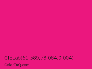 CIELab 51.589,78.084,0.004 Color is a normal rose color and the nearest color is Vivid Cerise #da1d81. Hex code #eb177e and RGB value is rgb(235,23,126). In RGB color space, this color is composed of 92% red, 9% green, 49% blue, In CMYK color space, this color is composed of 0% cyan, 90% magenta, 46% yellow , 8% black , In HSL color space, this color has a hue angle of 331° , 84% saturation and 51% lightness.