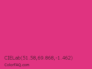 CIELab 51.58,69.868,-1.462 Color is a normal rose color and the nearest color is Cerise #da3287. Hex code #e03380 and RGB value is rgb(224,51,128). In RGB color space, this color is composed of 88% red, 20% green, 50% blue, In CMYK color space, this color is composed of 0% cyan, 77% magenta, 43% yellow , 12% black , In HSL color space, this color has a hue angle of 333° , 74% saturation and 54% lightness.