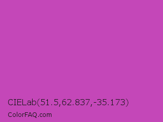 CIELab 51.5,62.837,-35.173 Color is a normal magenta color and the nearest color is Fuchsia Pink #c154c1. Hex code #c447b8 and RGB value is rgb(196,71,184). In RGB color space, this color is composed of 77% red, 28% green, 72% blue, In CMYK color space, this color is composed of 0% cyan, 64% magenta, 6% yellow , 23% black , In HSL color space, this color has a hue angle of 306° , 51% saturation and 52% lightness.