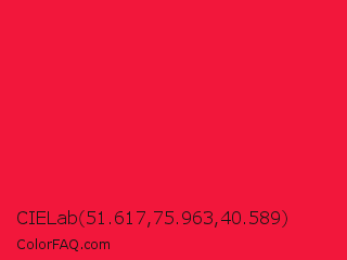 CIELab 51.617,75.963,40.589 Color is a normal red color and the nearest color is Red Ribbon #ed0a3f. Hex code #f2173b and RGB value is rgb(242,23,59). In RGB color space, this color is composed of 95% red, 9% green, 23% blue, In CMYK color space, this color is composed of 0% cyan, 90% magenta, 76% yellow , 5% black , In HSL color space, this color has a hue angle of 350° , 89% saturation and 52% lightness.